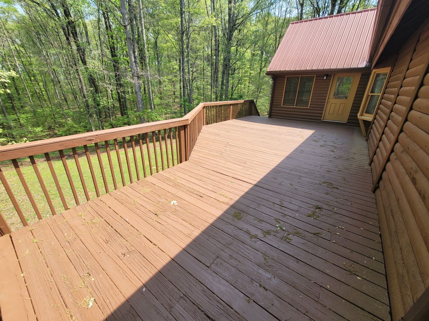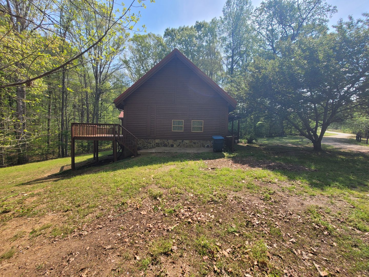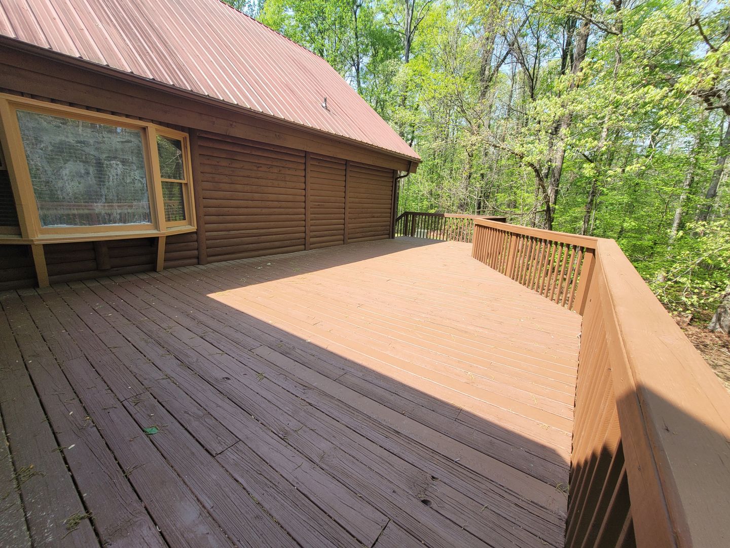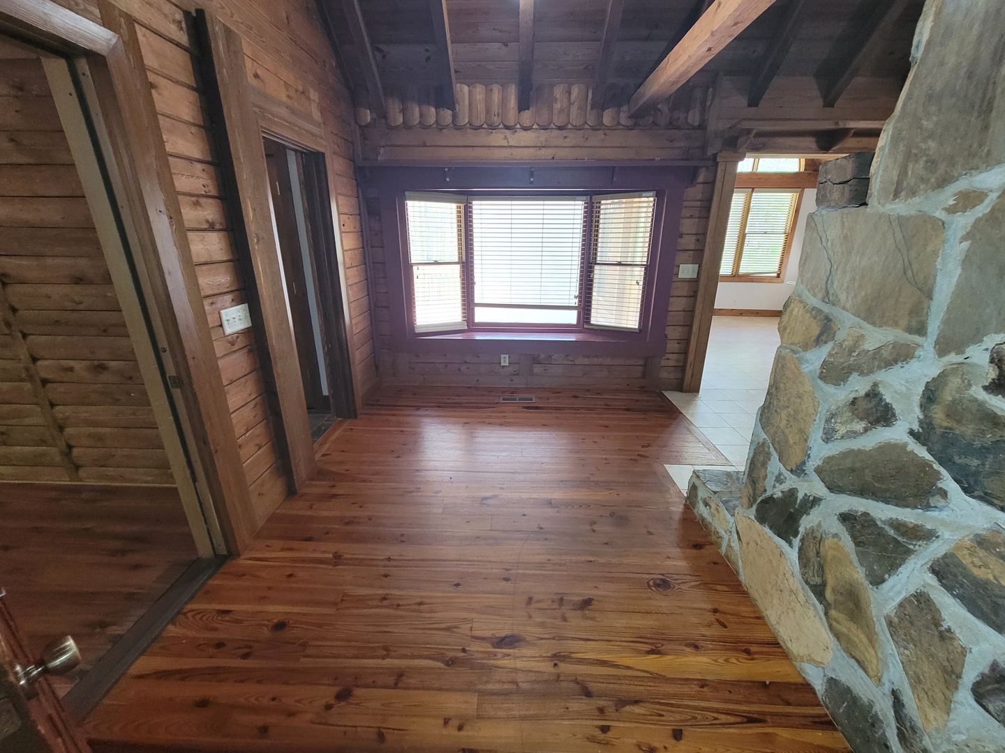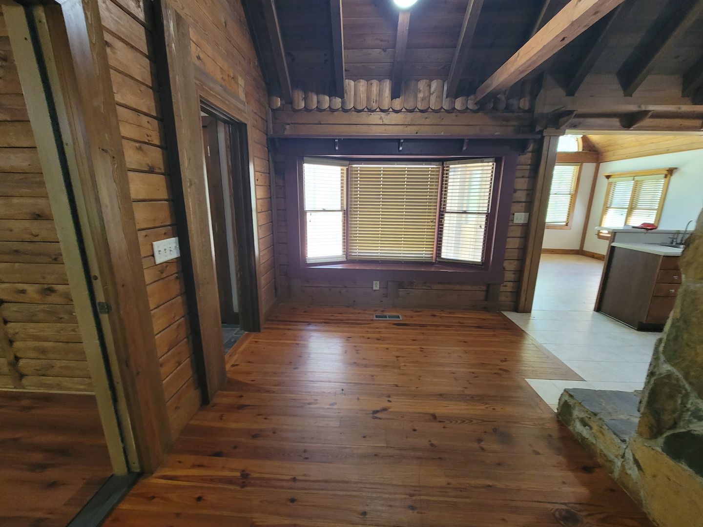 4 bedrooms, 2 bath cabin style home with private, wooded setting and views surrounding this property. Hardwood flooring throughout with most interior walls being made from log or wood paneling giving it a rustic, cabin feel. Everything is on the main level, except there is a 4th bedroom on the upstairs level. The 4th bedroom (upstairs) is extra long, having room for it's own den area.