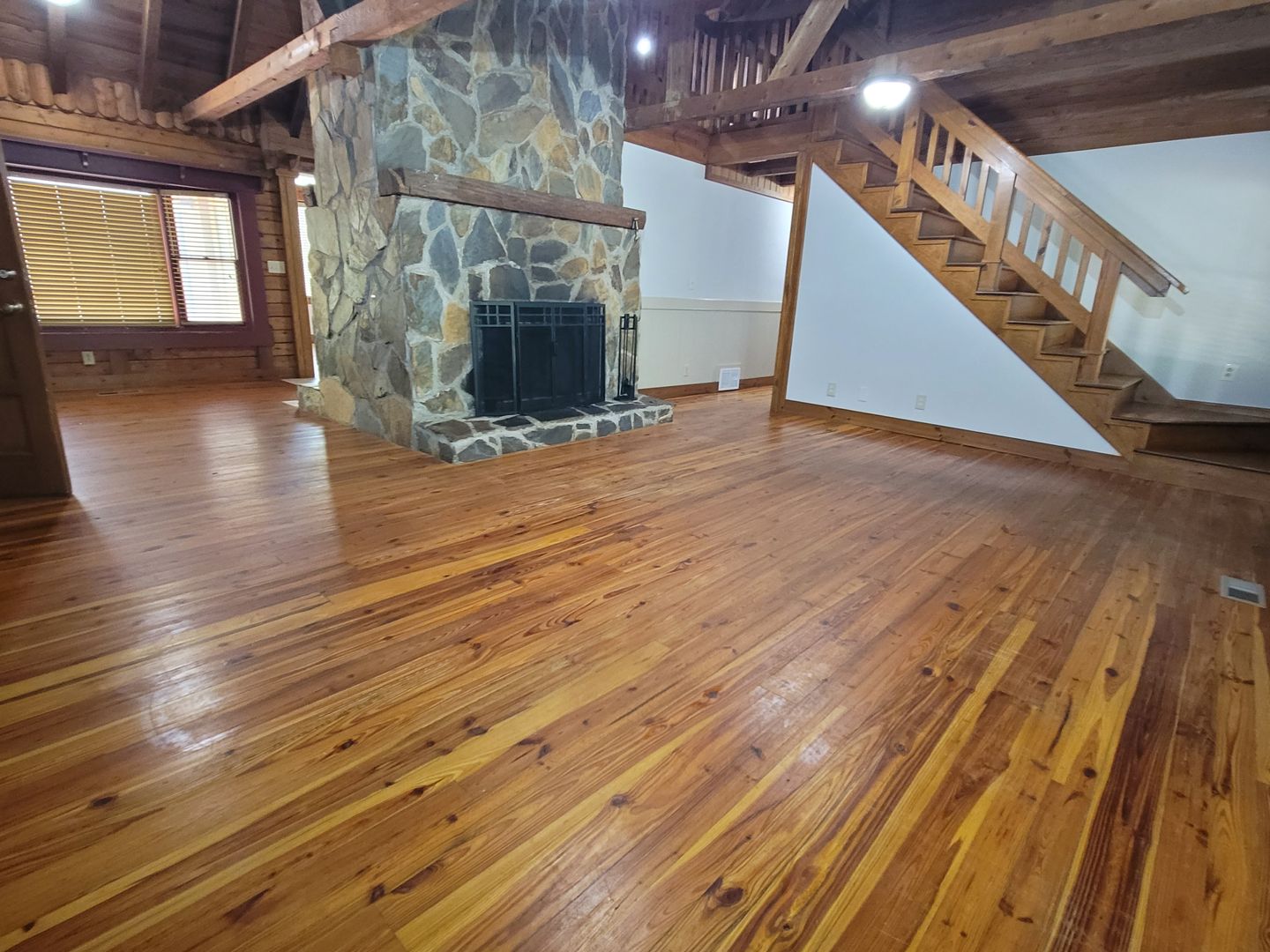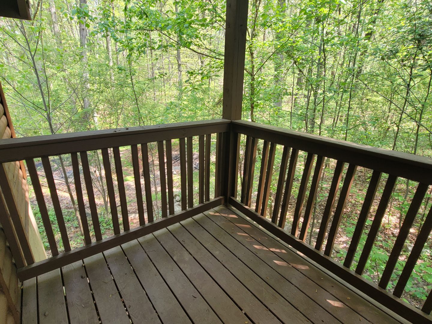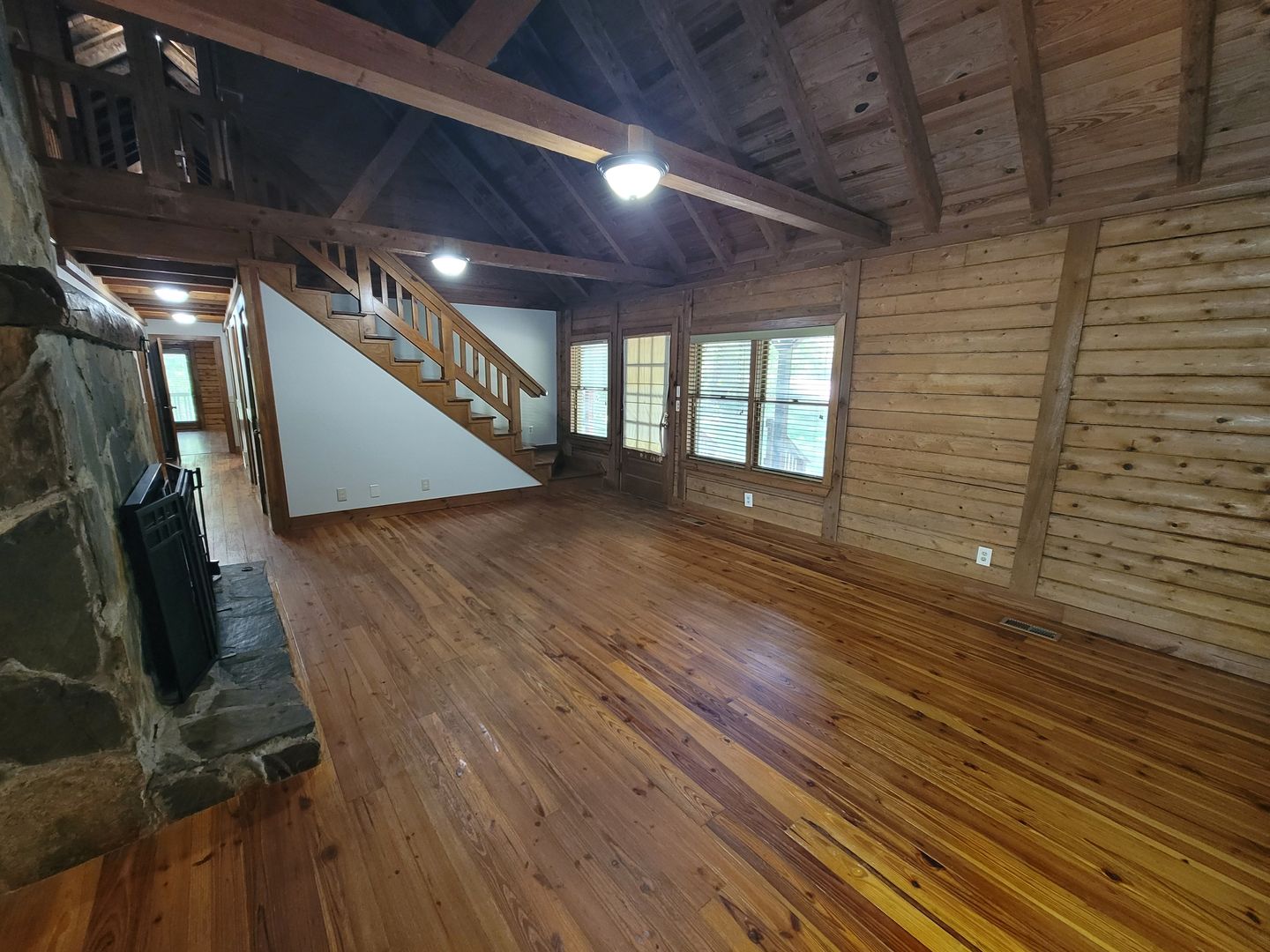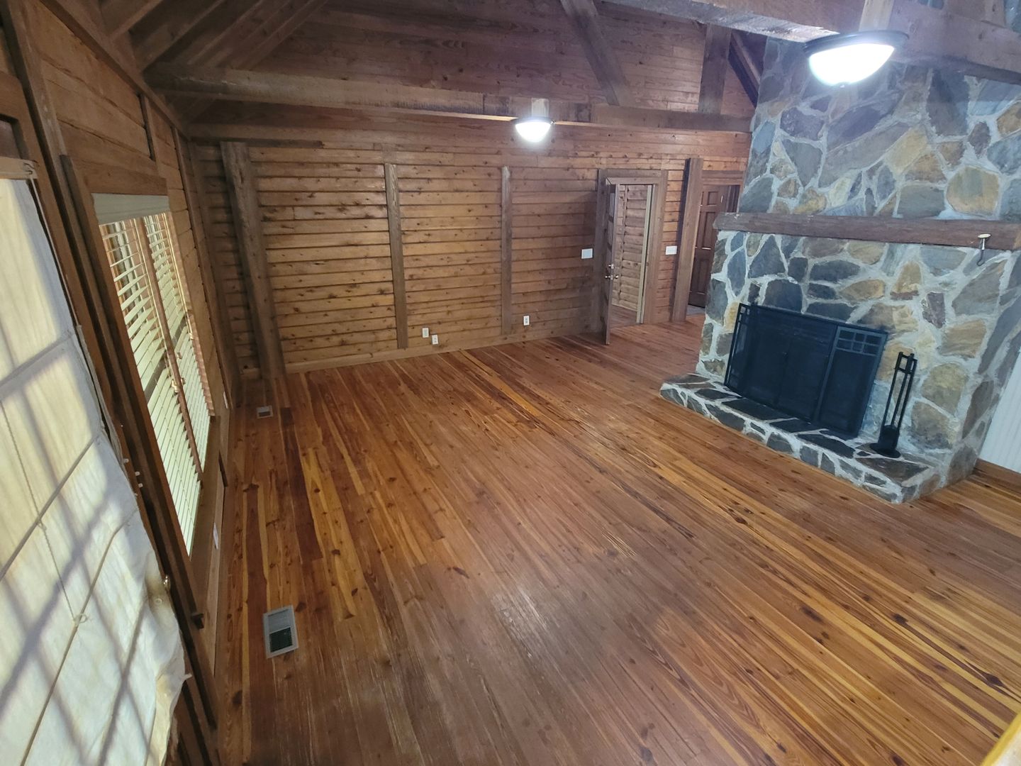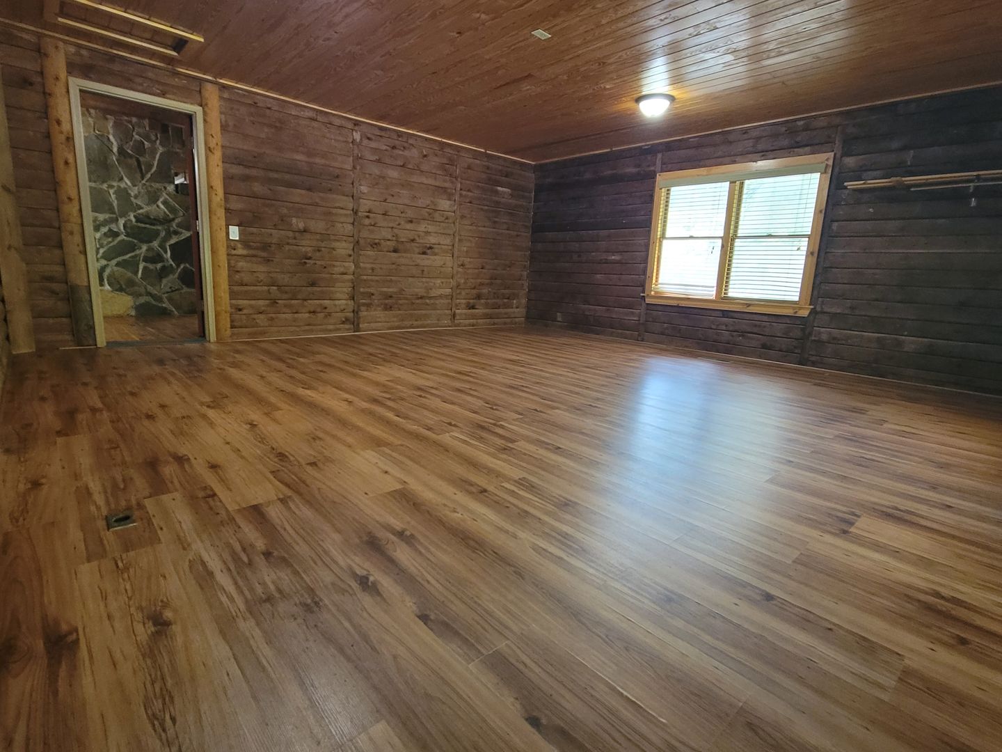 4 bedrooms, 2 bath cabin style home with private, wooded setting and views surrounding this property. Hardwood flooring throughout with most interior walls being made from log or wood paneling giving it a rustic, cabin feel. Everything is on the main level, except there is a 4th bedroom on the upstairs level. The 4th bedroom (upstairs) is extra long, having room for it's own den area.