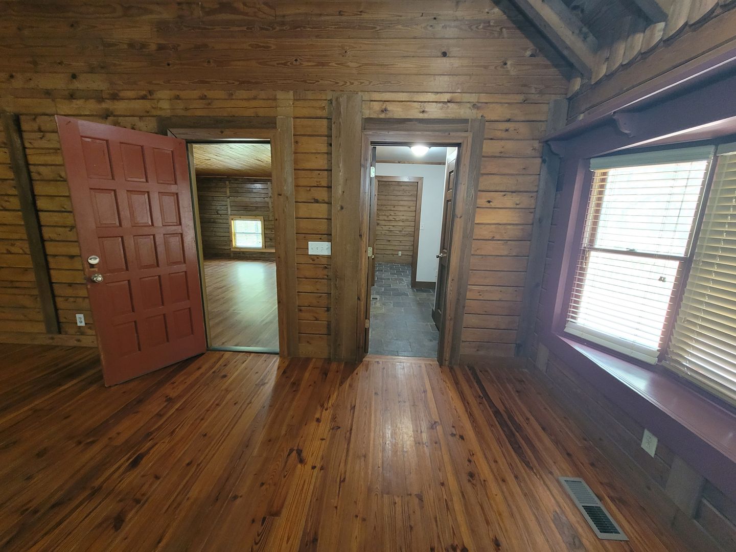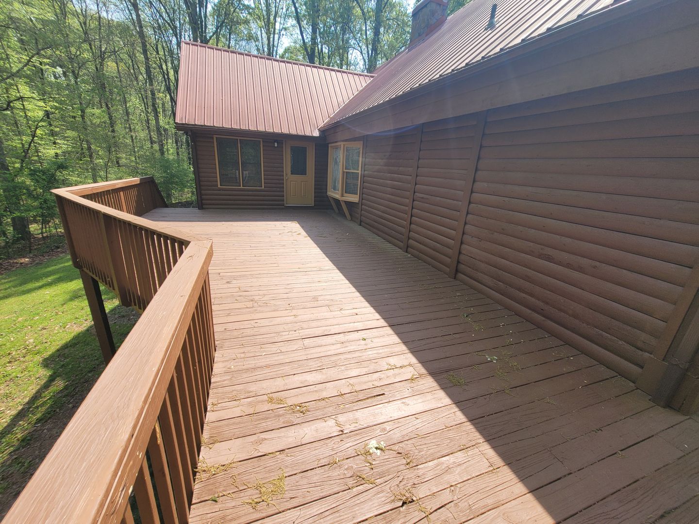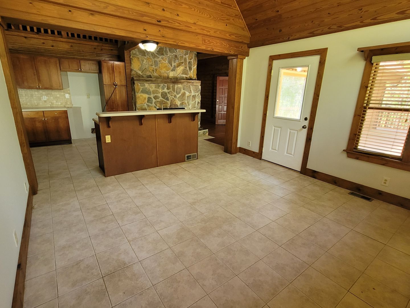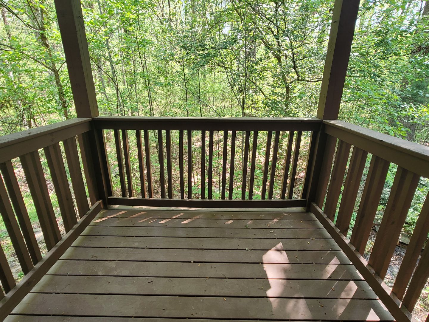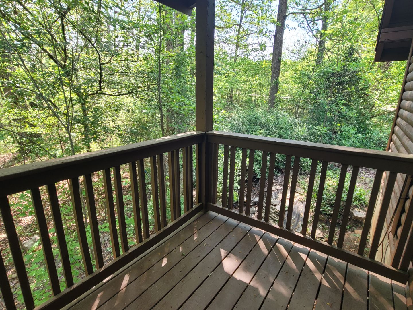 4 bedrooms, 2 bath cabin style home with private, wooded setting and views surrounding this property. Hardwood flooring throughout with most interior walls being made from log or wood paneling giving it a rustic, cabin feel. Everything is on the main level, except there is a 4th bedroom on the upstairs level. The 4th bedroom (upstairs) is extra long, having room for it's own den area.