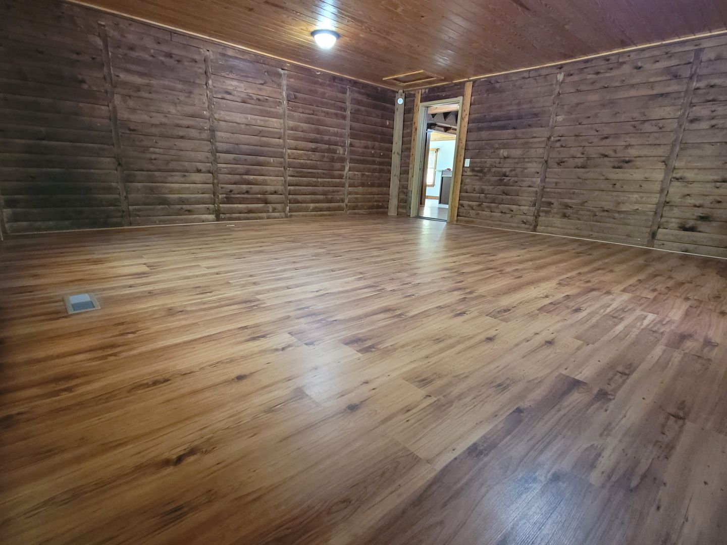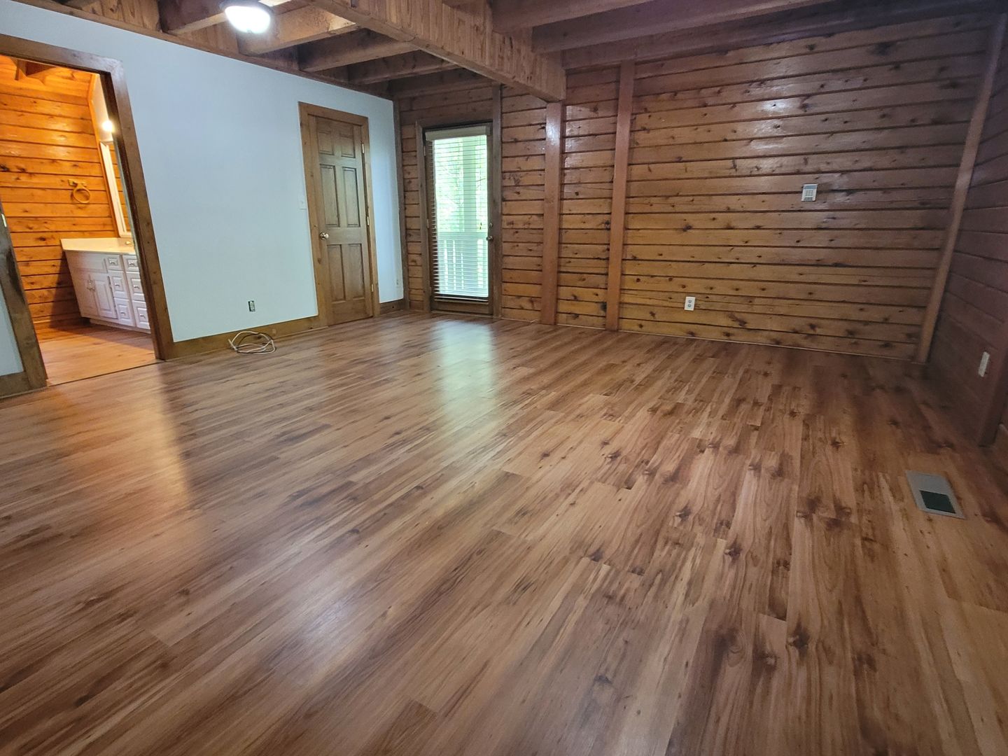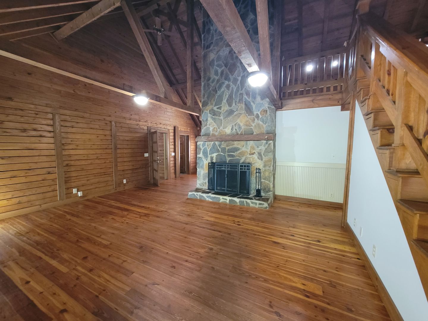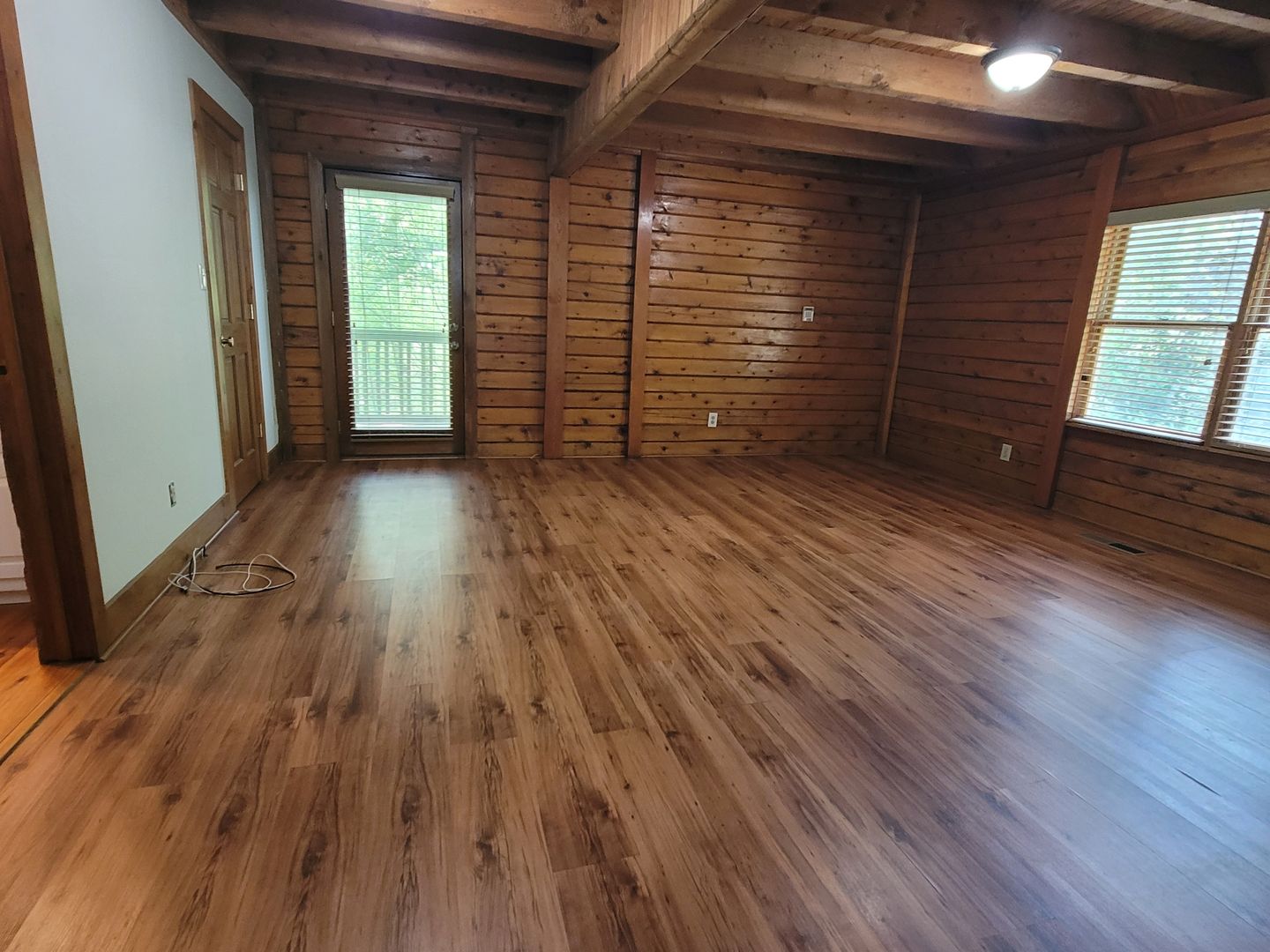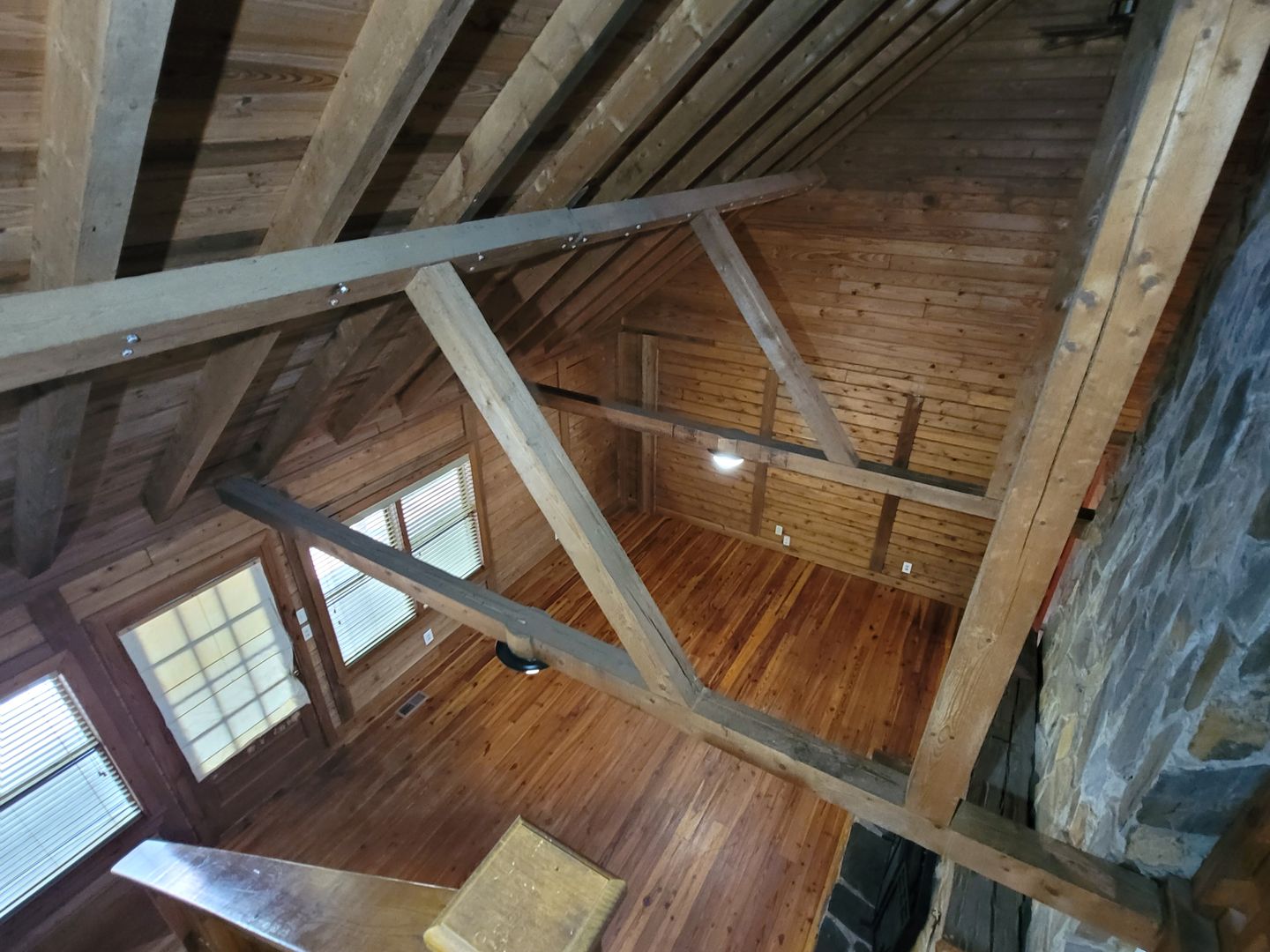 4 bedrooms, 2 bath cabin style home with private, wooded setting and views surrounding this property. Hardwood flooring throughout with most interior walls being made from log or wood paneling giving it a rustic, cabin feel. Everything is on the main level, except there is a 4th bedroom on the upstairs level. The 4th bedroom (upstairs) is extra long, having room for it's own den area.