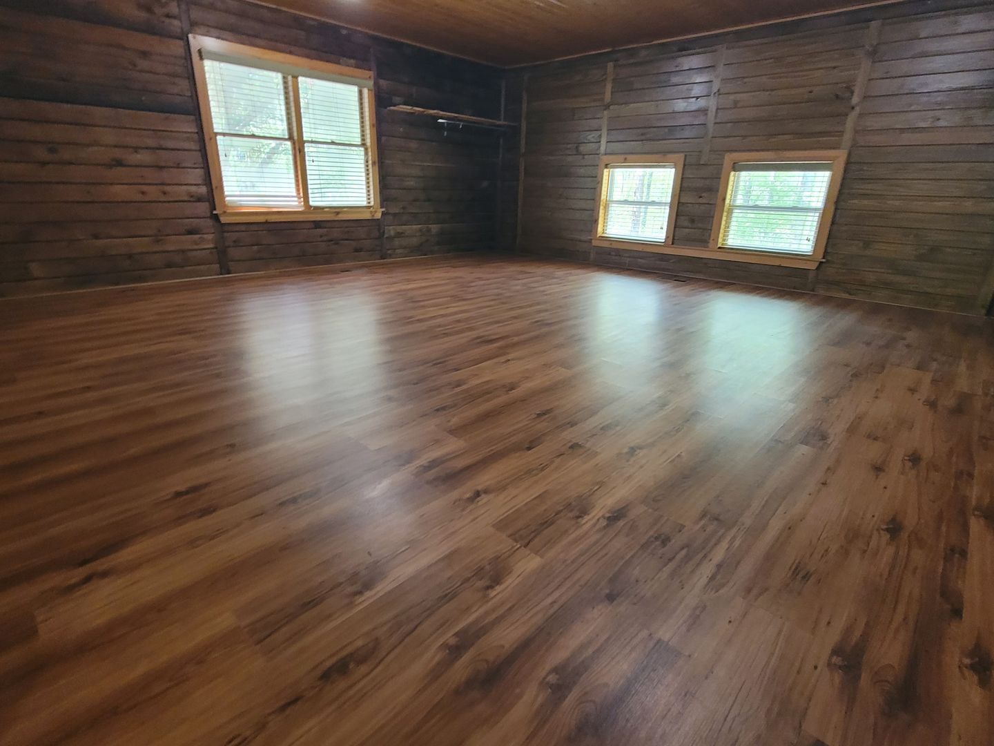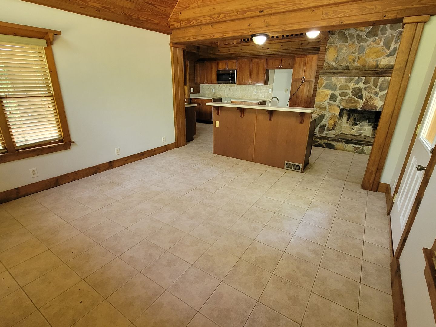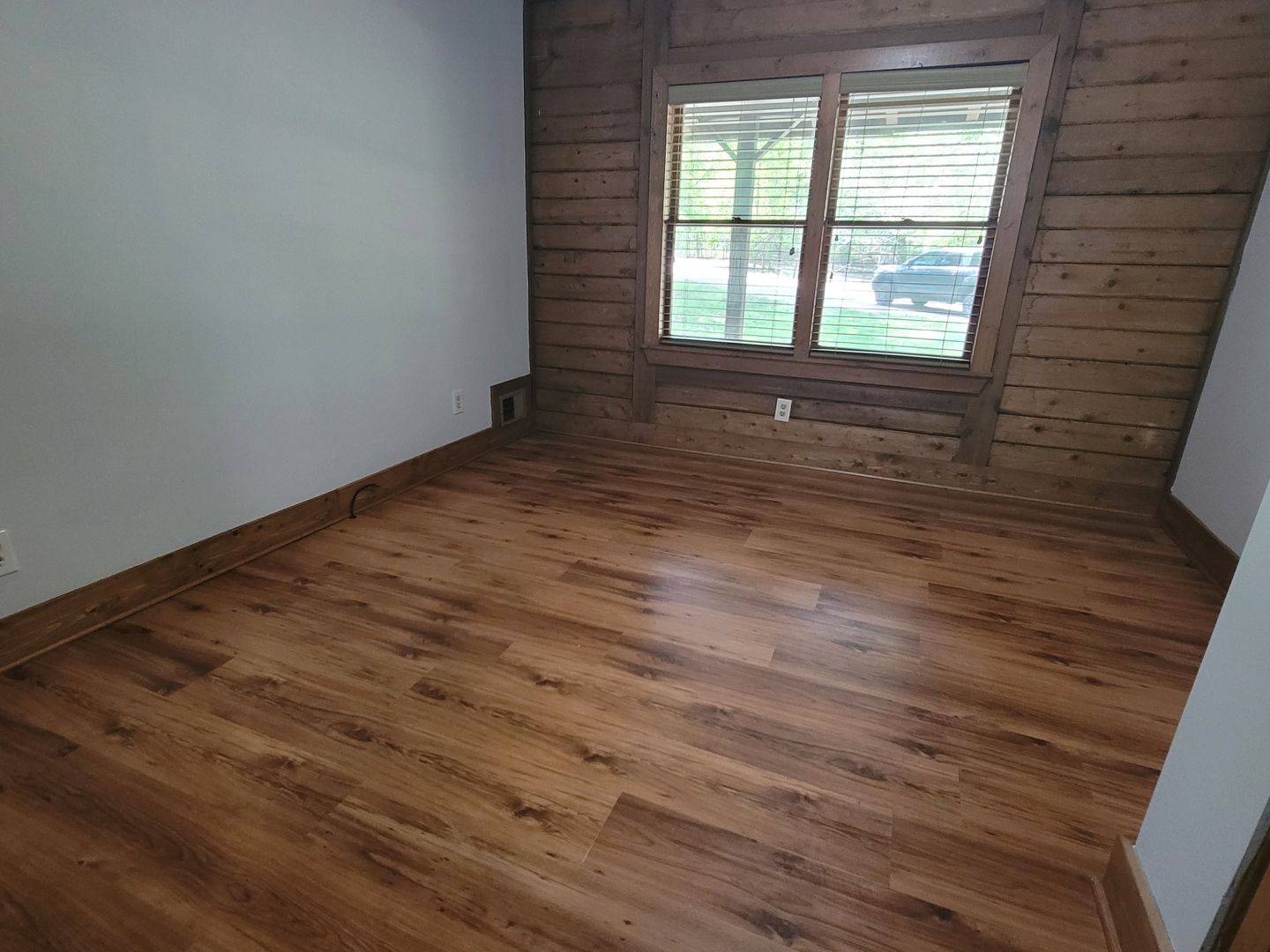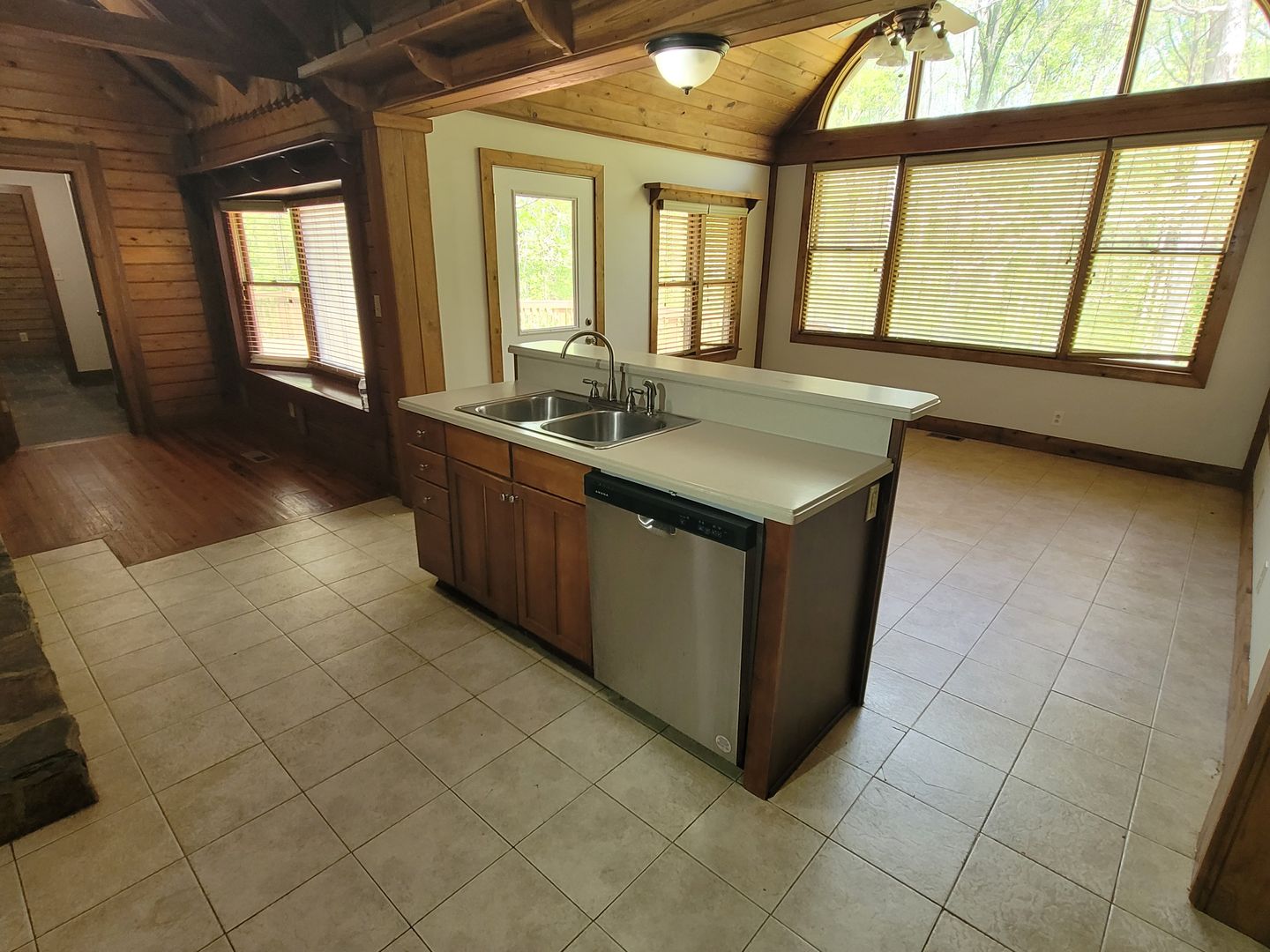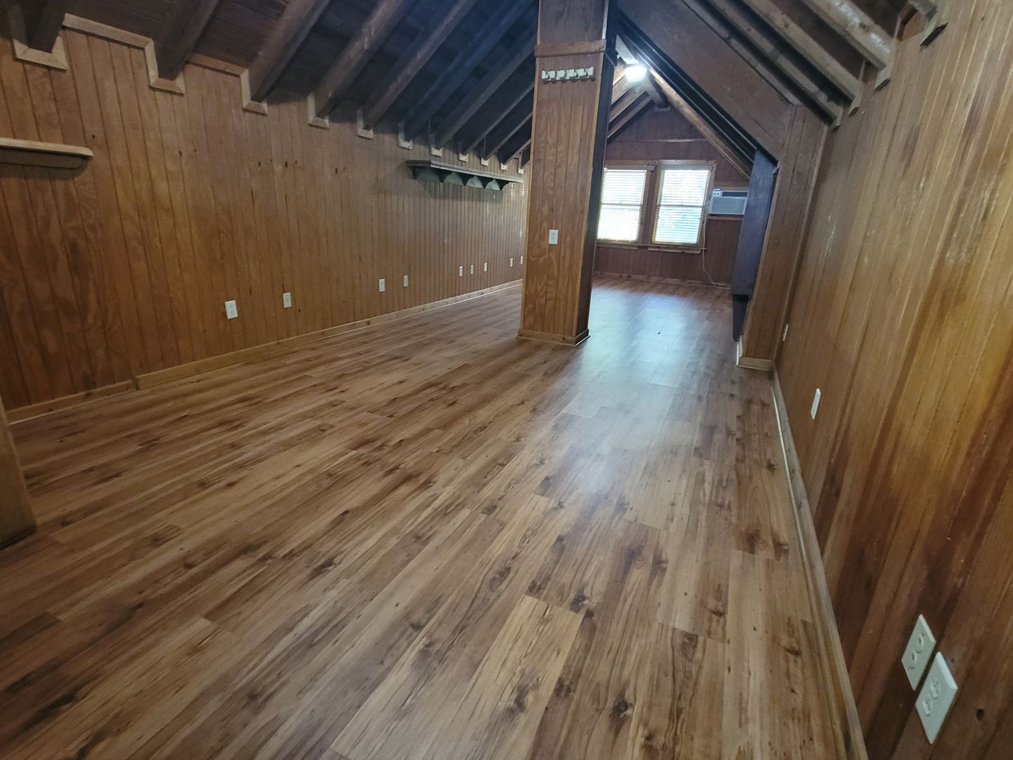 4 bedrooms, 2 bath cabin style home with private, wooded setting and views surrounding this property. Hardwood flooring throughout with most interior walls being made from log or wood paneling giving it a rustic, cabin feel. Everything is on the main level, except there is a 4th bedroom on the upstairs level. The 4th bedroom (upstairs) is extra long, having room for it's own den area.