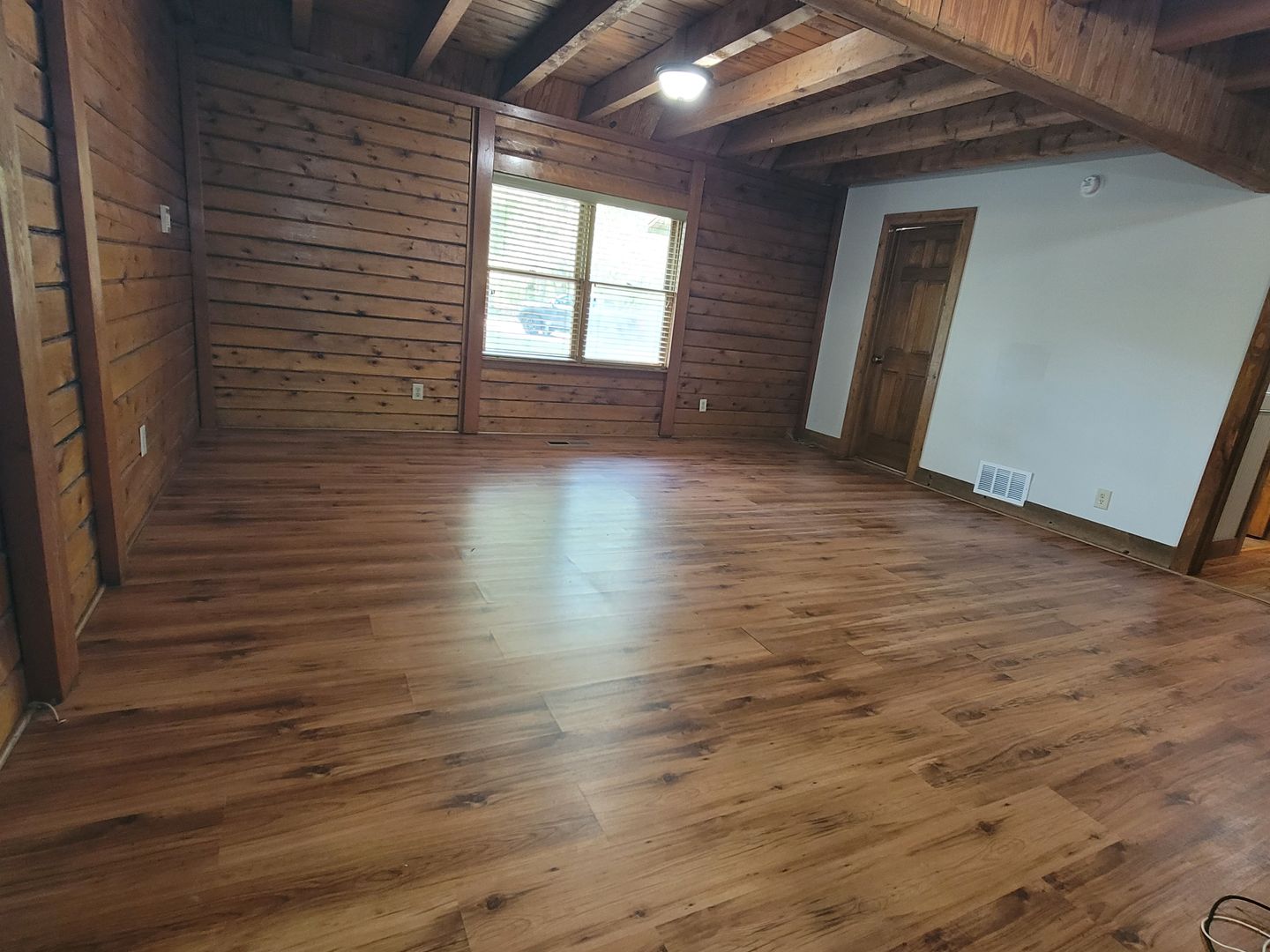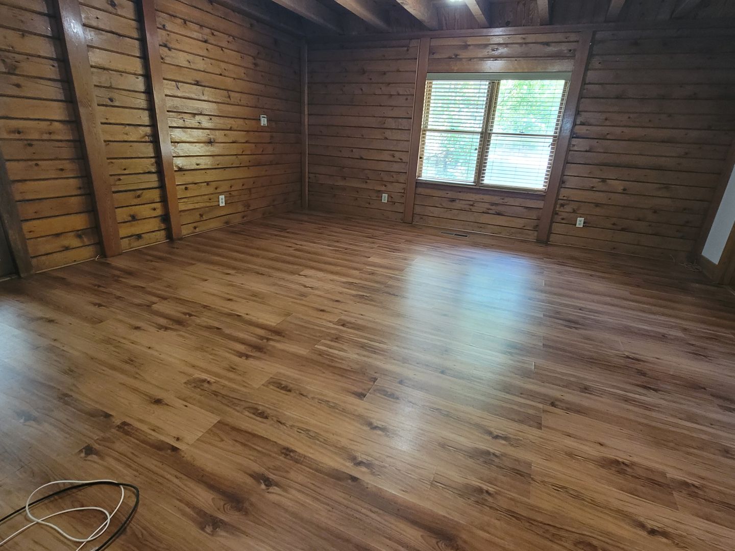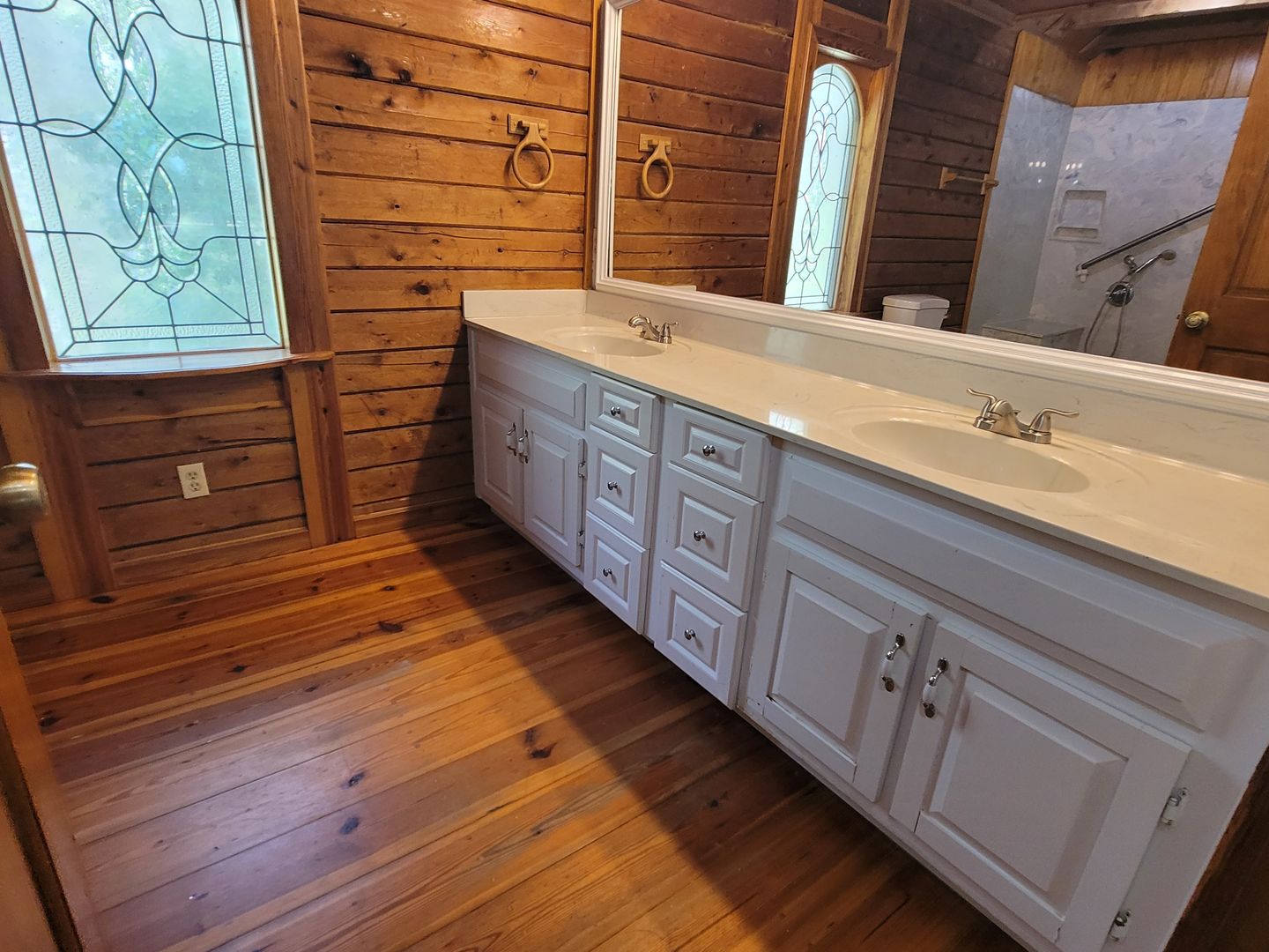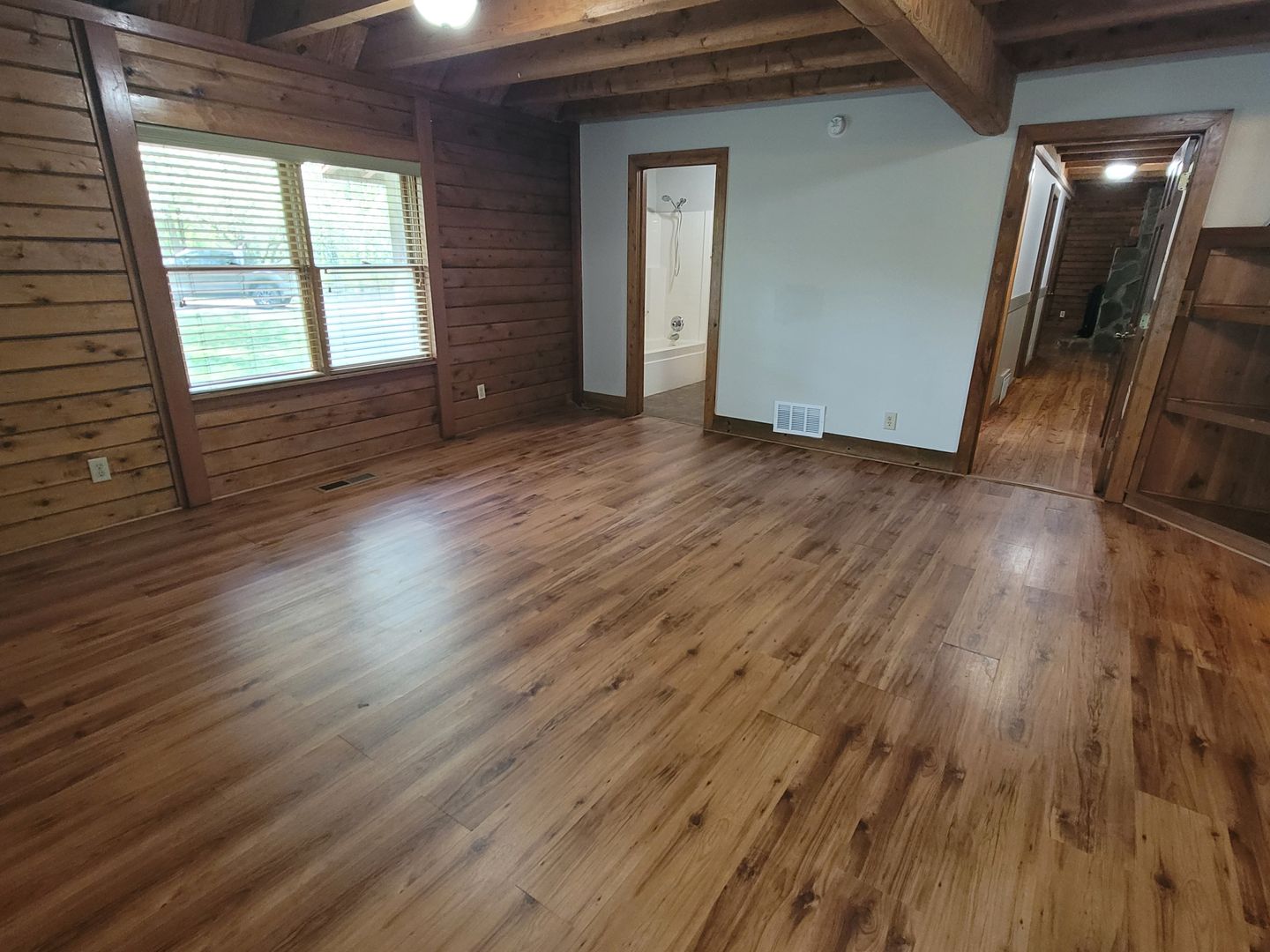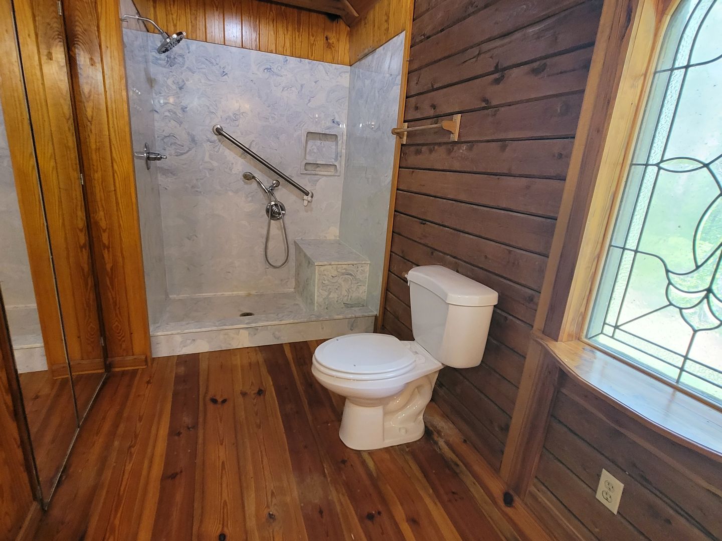 4 bedrooms, 2 bath cabin style home with private, wooded setting and views surrounding this property. Hardwood flooring throughout with most interior walls being made from log or wood paneling giving it a rustic, cabin feel. Everything is on the main level, except there is a 4th bedroom on the upstairs level. The 4th bedroom (upstairs) is extra long, having room for it's own den area.