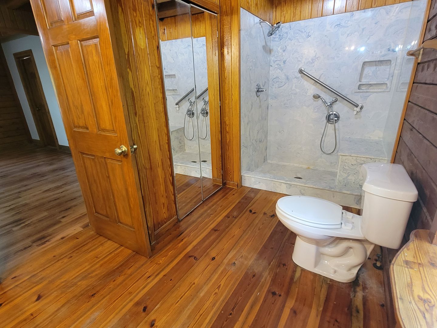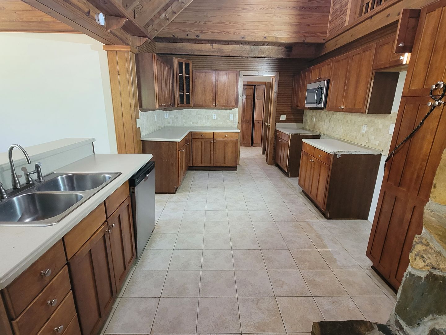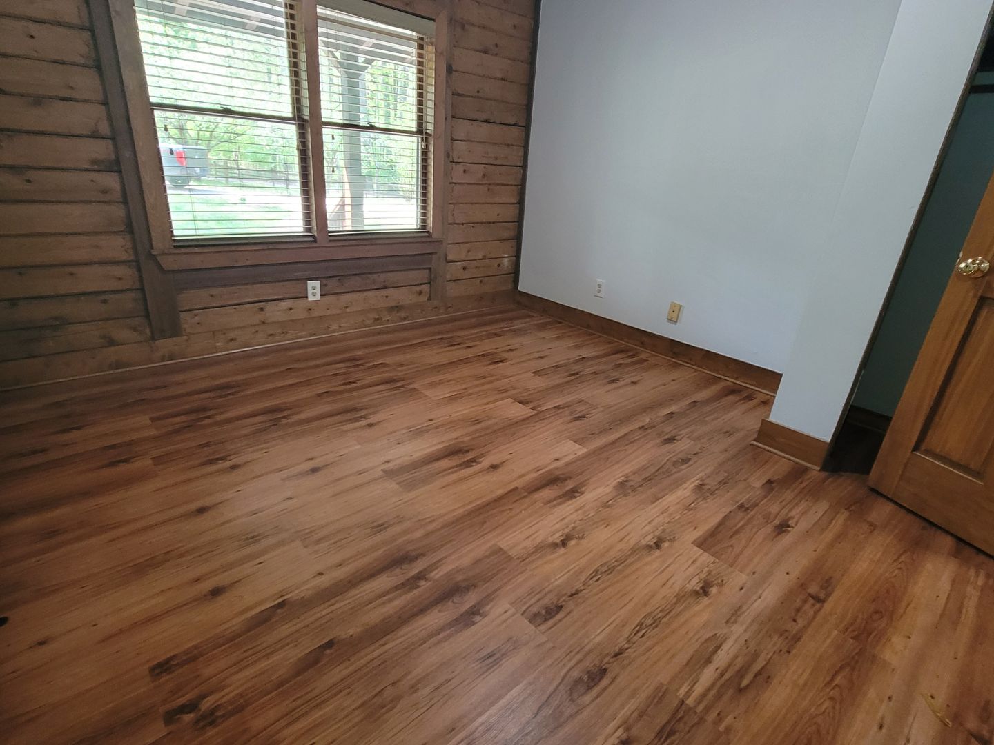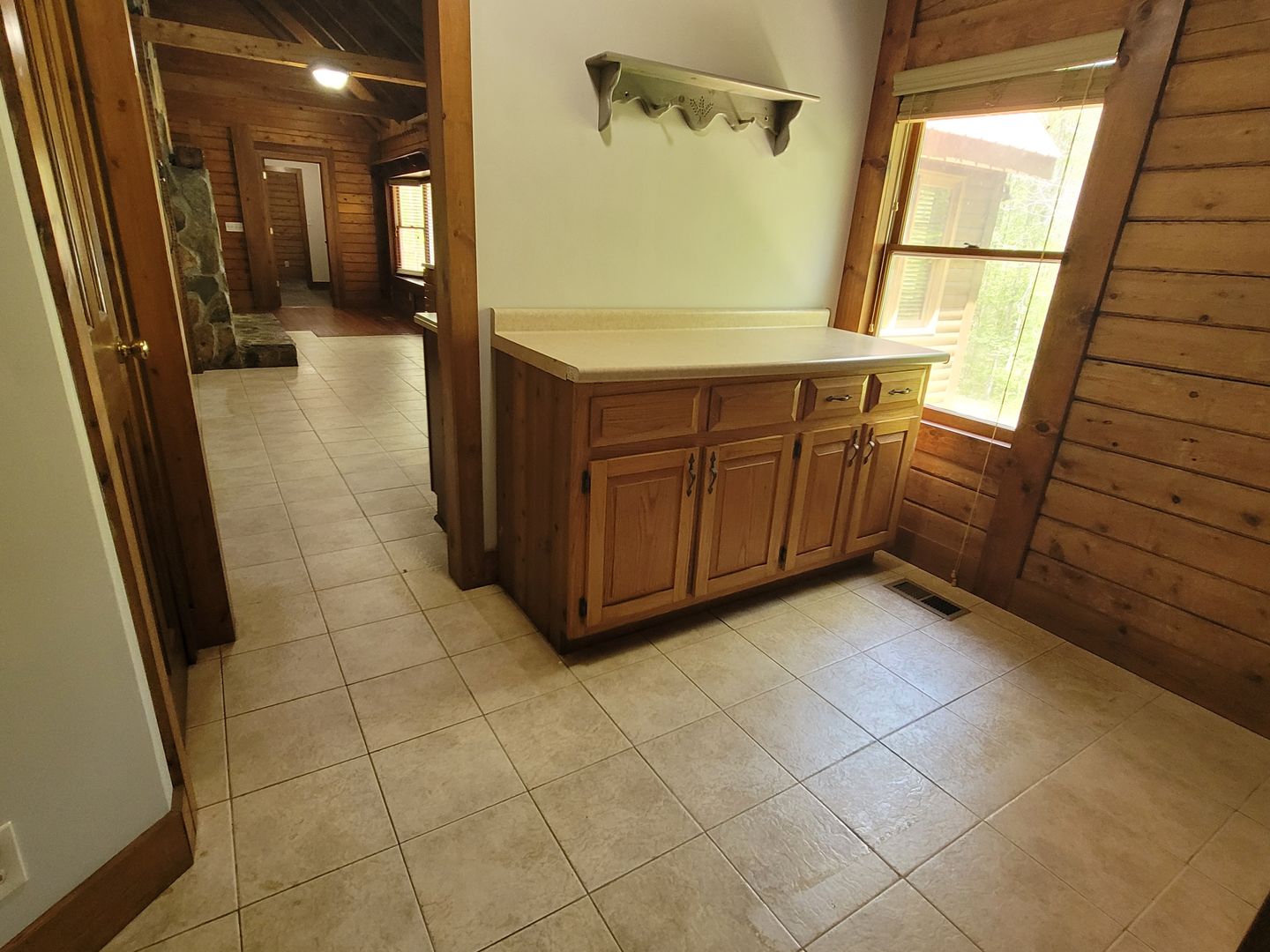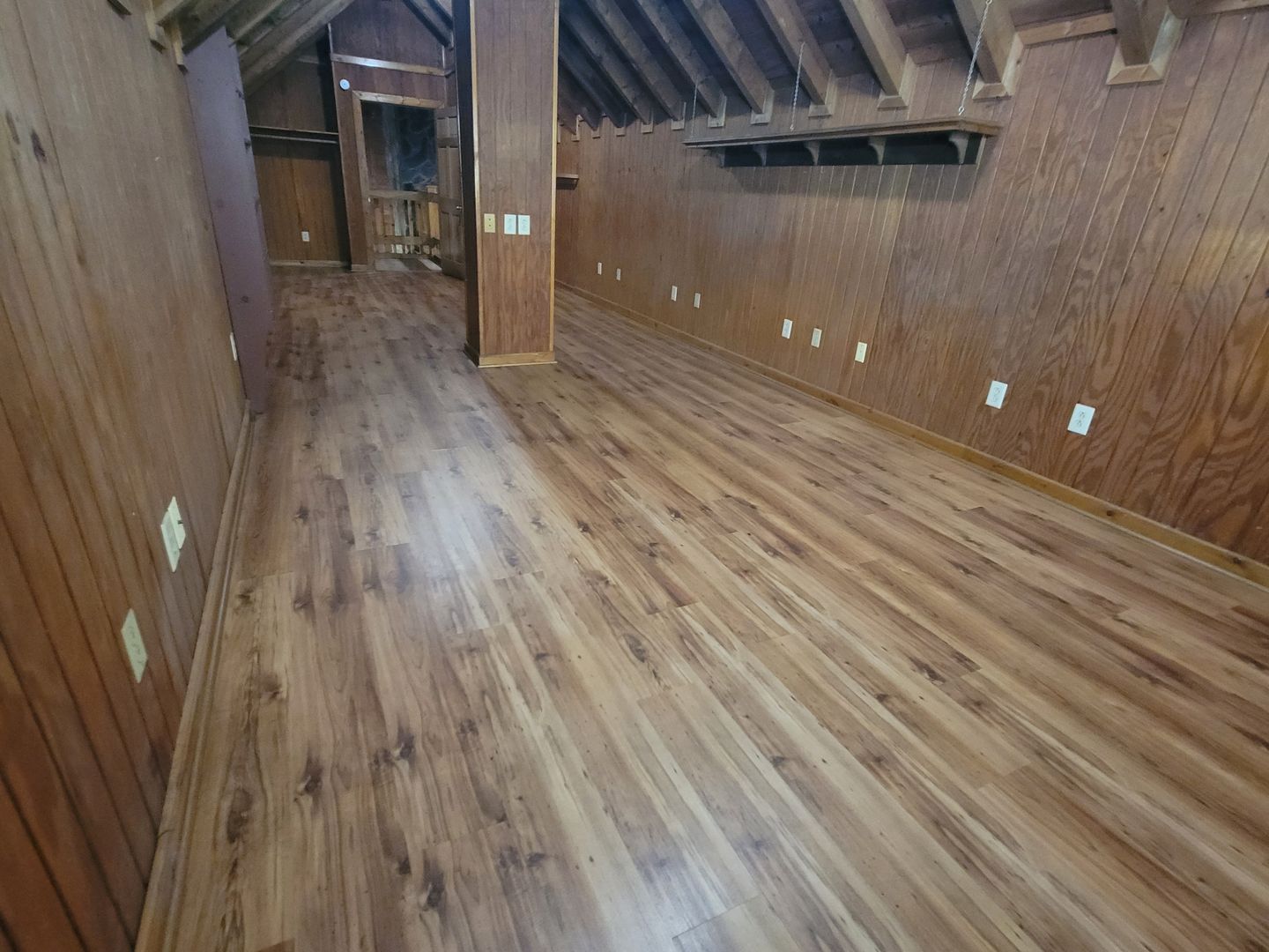 4 bedrooms, 2 bath cabin style home with private, wooded setting and views surrounding this property. Hardwood flooring throughout with most interior walls being made from log or wood paneling giving it a rustic, cabin feel. Everything is on the main level, except there is a 4th bedroom on the upstairs level. The 4th bedroom (upstairs) is extra long, having room for it's own den area.