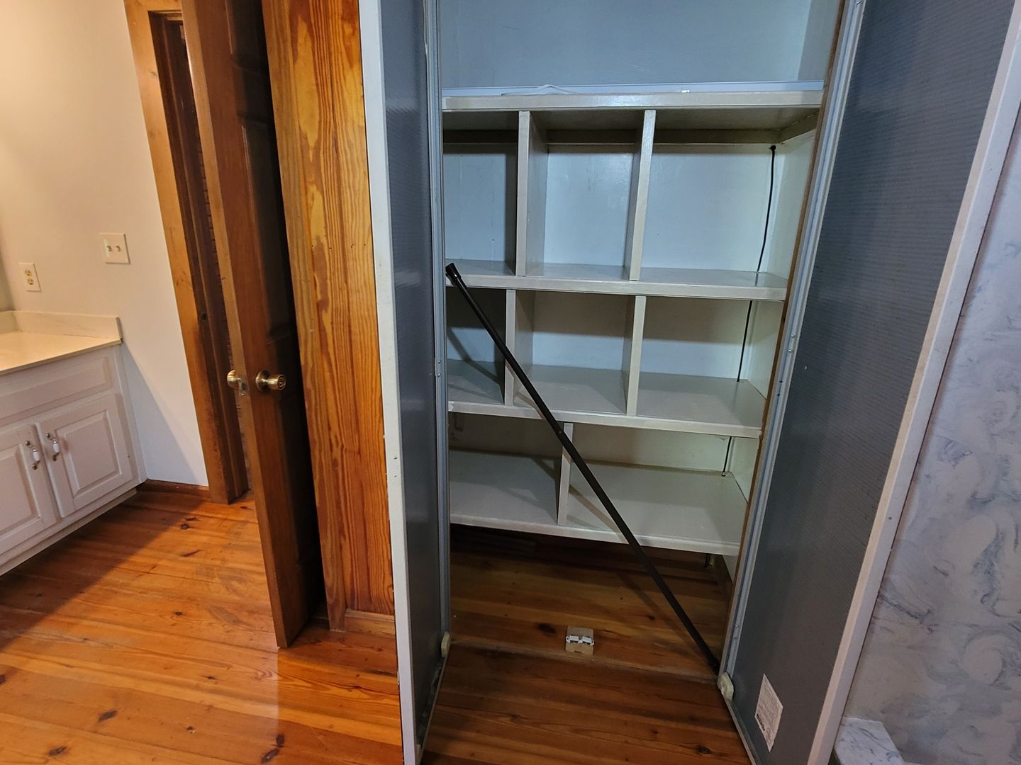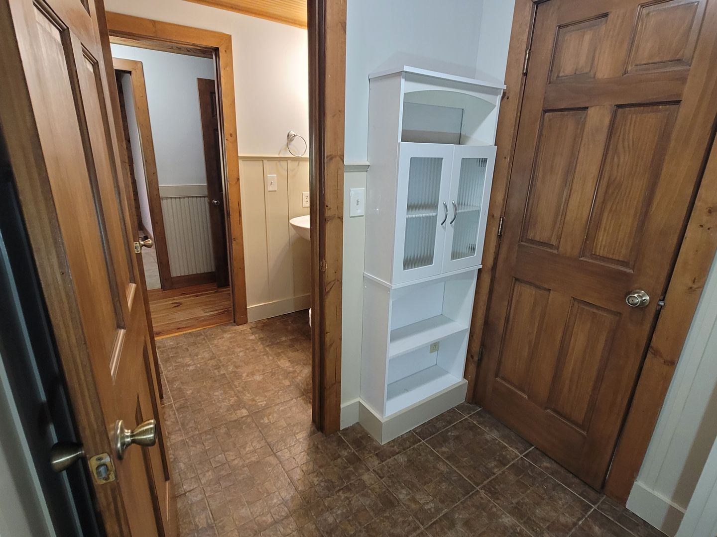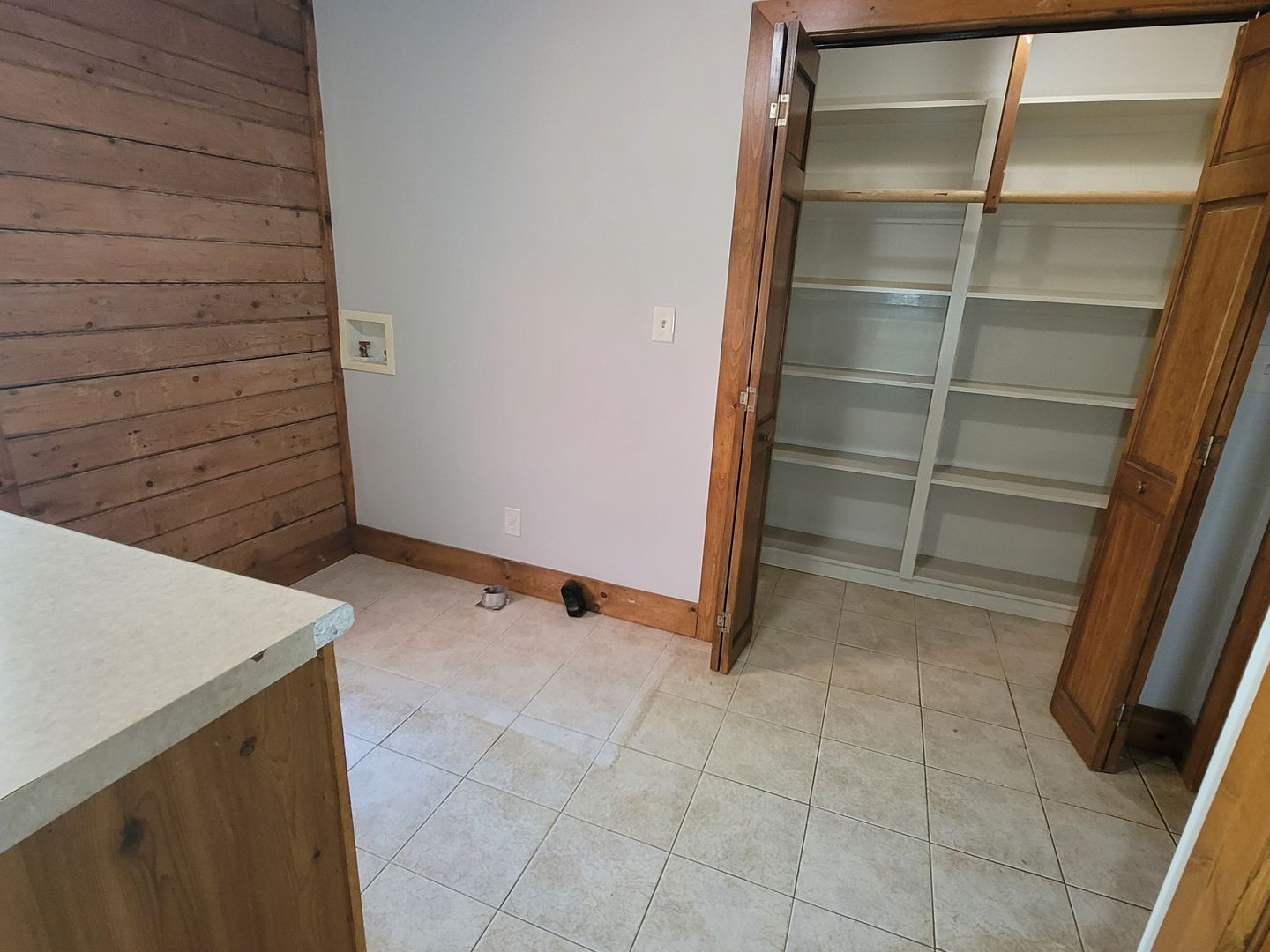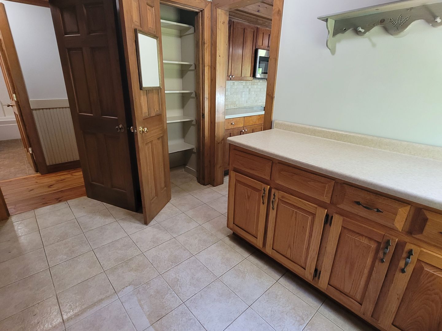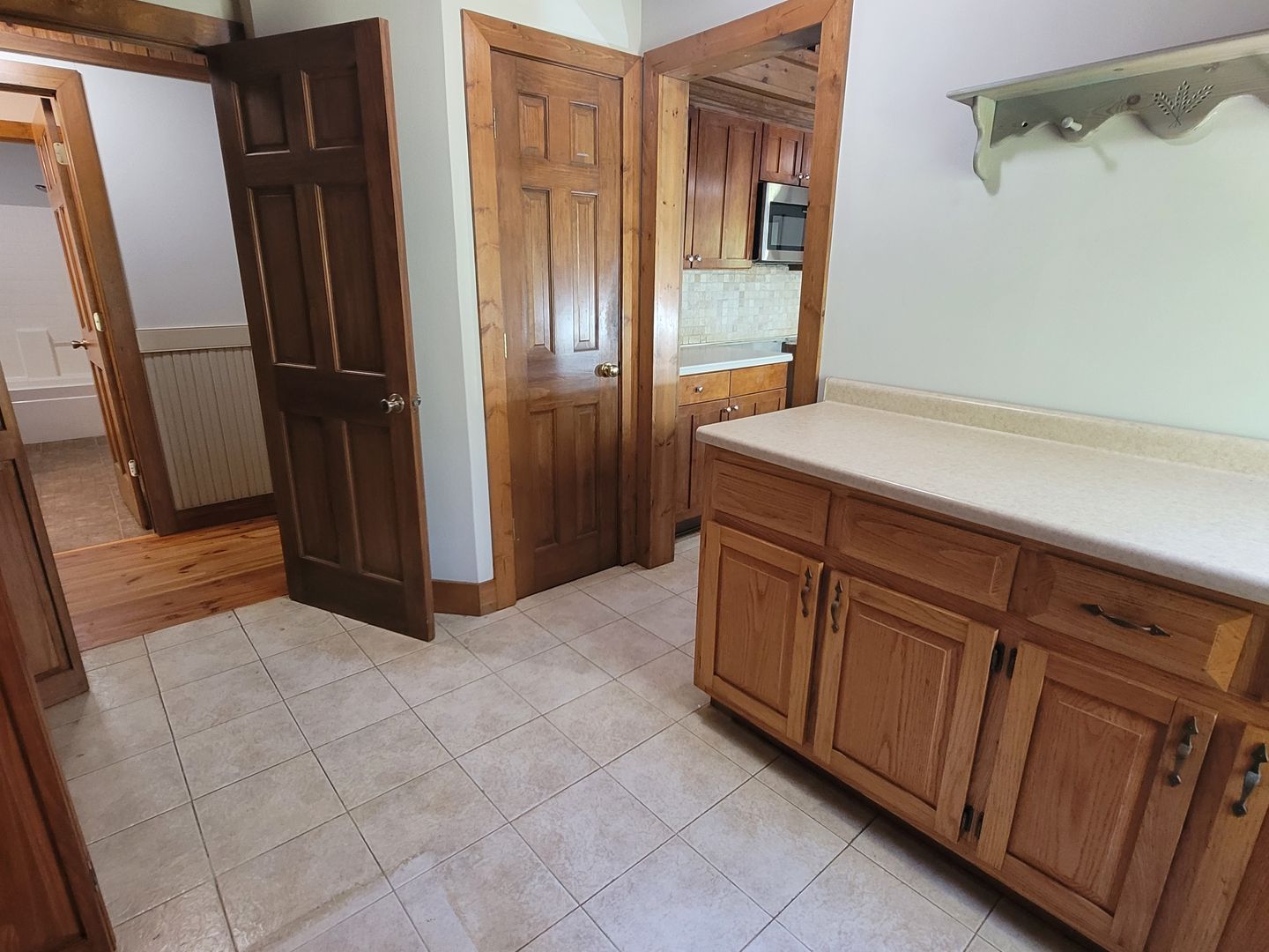 There is a large, separate laundry room with washer/dryer connections only, with great counterspace. cabinets and some shelving in a large closet! A large, enclosed garage makes the 3rd bedroom, or it could be a den or bonus room. There is a large rear deck, great for entertaining or relaxing and with lovely, wooded views. There is a patio on the lower level that is suitable for grilling, a picnic table, etc. There is covered area adjacent to the patio area, that could be used for keeping a lawn mower, bicycles, etc.